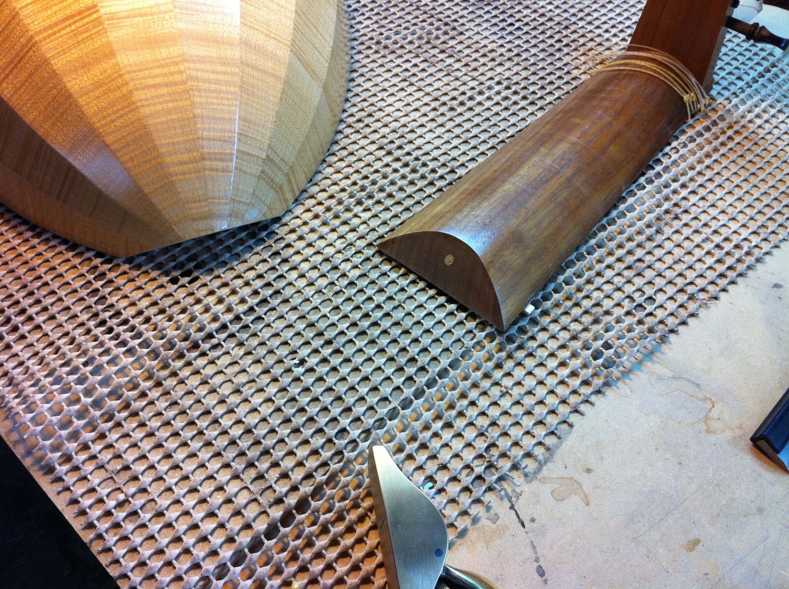 The neck is now fitted to the body at the proper angle. Just before glueing, it is useful to saturate the end grain with some hot hide glue. Otherwise the end grain could suck up the glue and starve the joint. Once this step is complete, the joint will get one final review and then it will be glued.